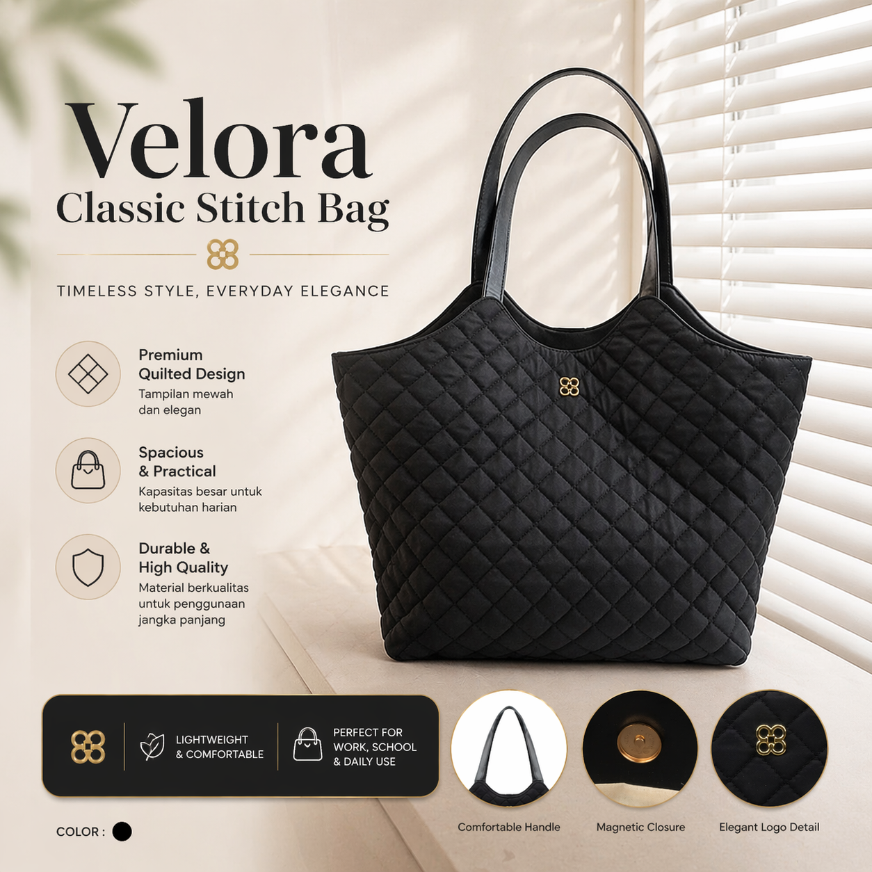 Tas elegan dengan desain quilted klasik yang timeless dan berkelas. Dilengkapi aksen emas yang mewah serta ruang luas untuk kebutuhan harian. Material premium dan penutup magnetik membuatnya praktis, nyaman, dan tahan lama—sempurna untuk aktivitas sehari-hari maupun acara semi-formal.